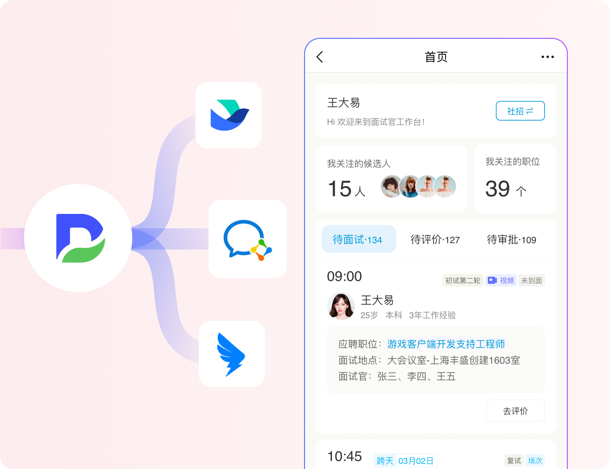 ▲ 用友大易面试官移动端工作台:待面试、待评价、待审批一目了然,随时随地完成面试安排与评价提交